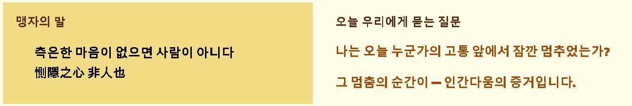 - Q: 어떻게 하면 이 마음을 기를 수 있나요? 평소 호연지기를 기르듯 대자연의 생명력에 귀 기울이고, 타인의 처지를 내 상황처럼 대입해보는 연습이 필요합니다.