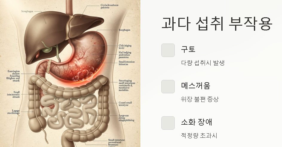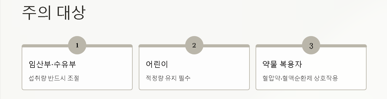 임산부·수유부·어린이는 섭취량을 반드시 조절해야 하며, 혈압약·혈액순환제 등을 복용 중이라면 상호작용이 있을 수 있으므로 전문가 상담이 권장됩니다. 다량 섭취 시 구토·메스꺼움 같은 위장 불편도 나타날 수 있습니다.