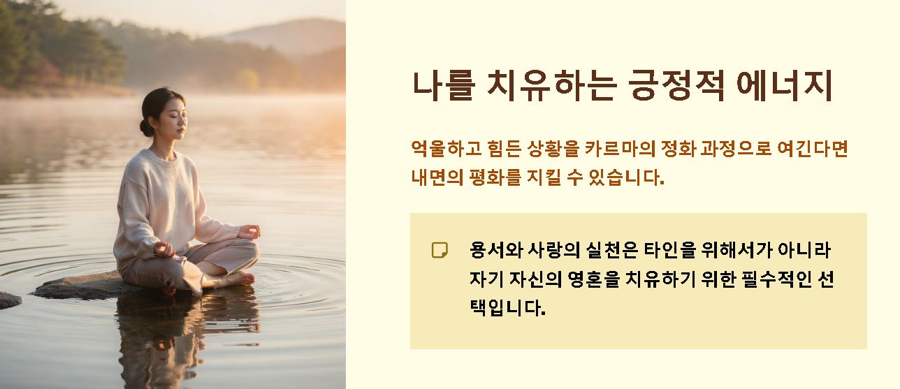 살다 보면 억울하거나 힘든 상황에 처할 때가 있지만, 이를 카르마의 정화 과정으로 여긴다면 내면의 평화를 지킬 수 있습니다. 고난을 성장의 기회로 승화시키는 태도는 불필요한 원망과 분노를 줄여주는데요. 용서와 사랑을 실천하는 것은 타인을 위해서가 아니라 결국 자기 자신의 영혼을 치유하기 위한 필수적인 선택입니다.