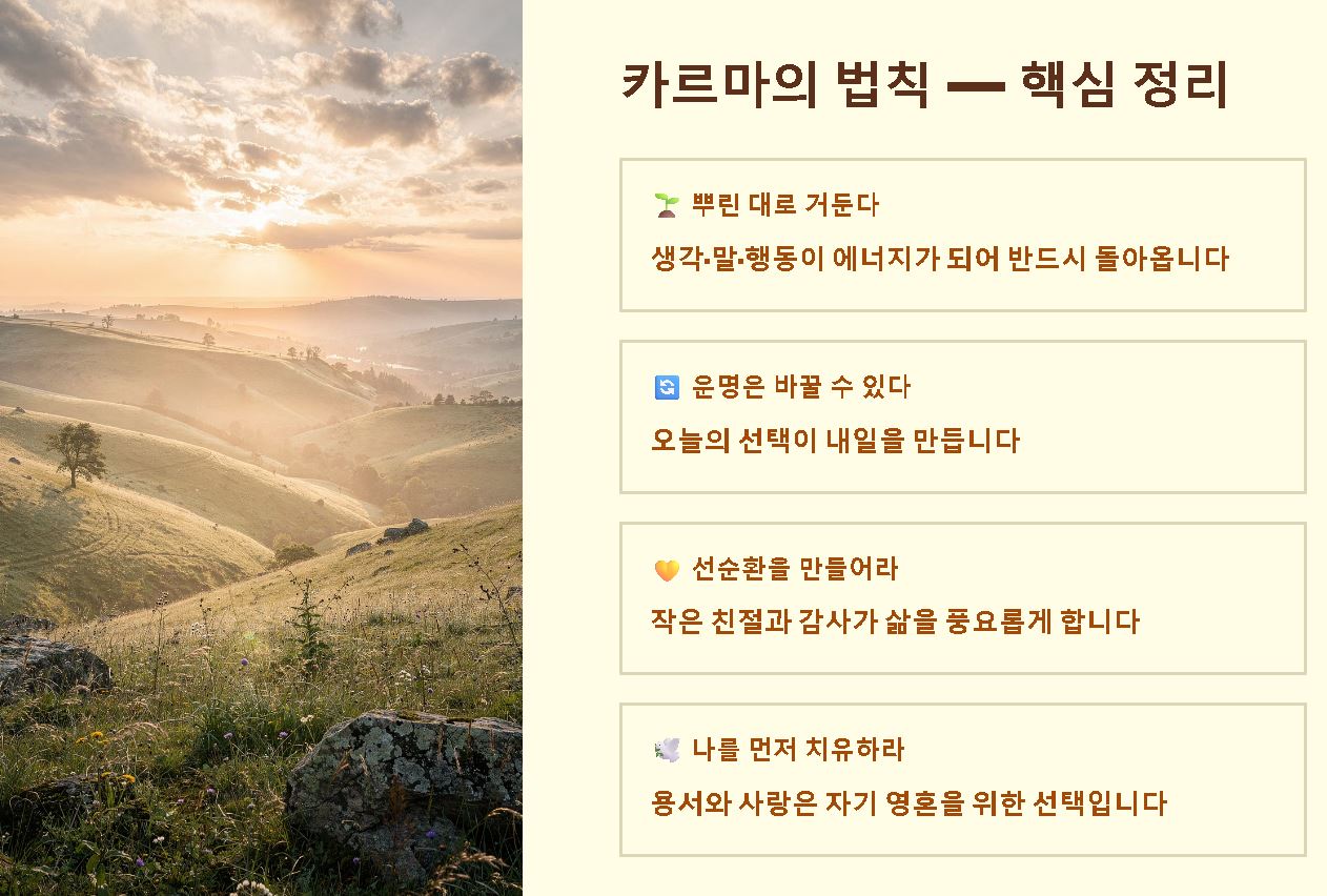요약: 카르마의 법칙은 행위와 결과 사이의 정밀한 연결 고리를 의미하며 삶을 성찰하게 만드는 지혜로운 나침반입니다.