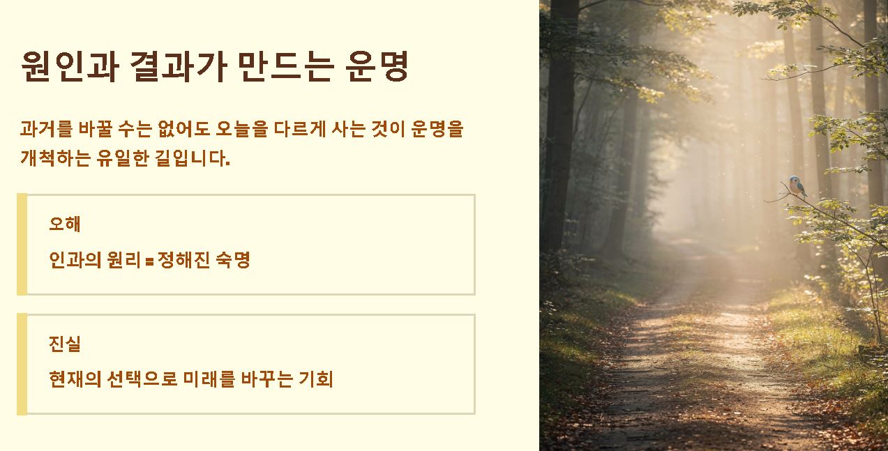 요약: 운명은 고정된 것이 아니며 카르마를 이해하고 오늘을 충실히 살아낼 때 비로소 긍정적인 방향으로 나아갑니다.