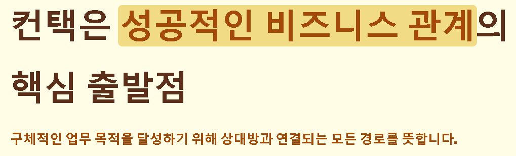 요약: 컨택은 구체적인 업무 목적을 달성하기 위해 상대방과 연결되는 모든 경로를 뜻하며, 성공적인 비즈니스 관계를 만드는 핵심 출발점입니다.