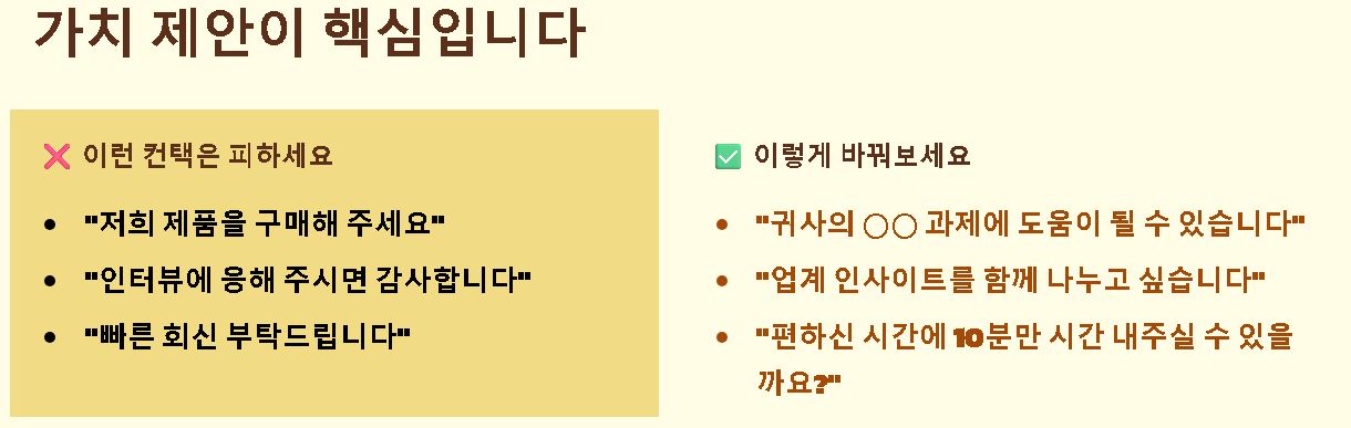 요약: 컨택의 성공은 상대방에 대한 배려와 명확한 가치 제안, 그리고 지속적인 관계 관리를 통해 완성되는 고도의 커뮤니케이션 활동입니다.