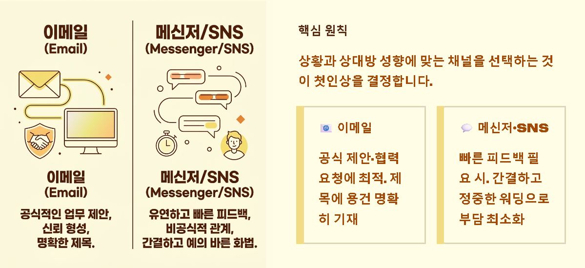 - 메신저와 SNS의 유연함: 비교적 친밀한 관계이거나 빠른 피드백이 필요할 때 활용하며, 간결하면서도 정중한 워딩을 통해 상대의 부담을 줄여주는 것이 핵심입니다.