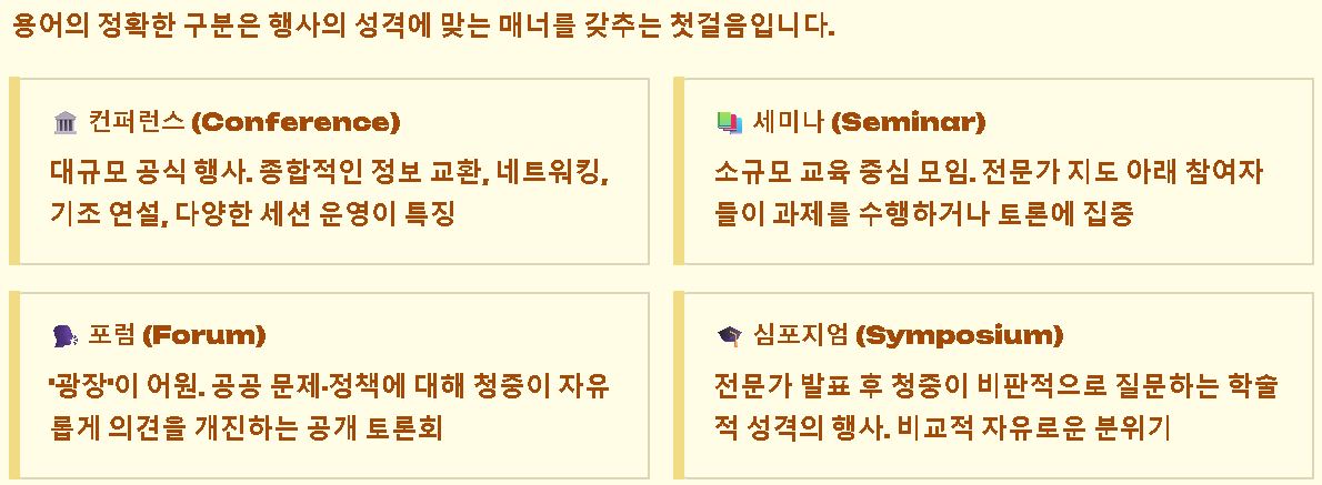 일상에서 혼용되기 쉬운 행사 명칭들은 그 규모와 소통의 지향점에 따라 명확한 층위가 나뉩니다. 용어의 정확한 구분은 행사의 성격에 맞는 매너를 갖추는 첫걸음이 됩니다.