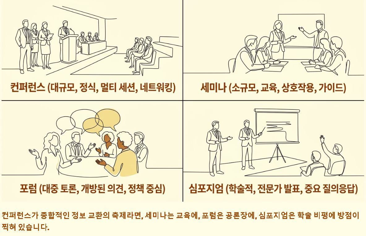 요약: 컨퍼런스가 종합적인 정보 교환의 축제라면, 세미나는 교육에, 포럼은 공론장에 더 큰 방점이 찍혀 있습니다.