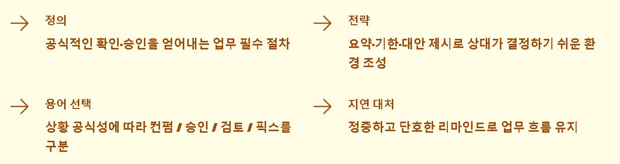요약: 컨펌받다의 과정은 단순히 기다리는 것이 아니라, 상대가 결정을 내리기 쉽게 가이드를 제공하는 협상입니다.