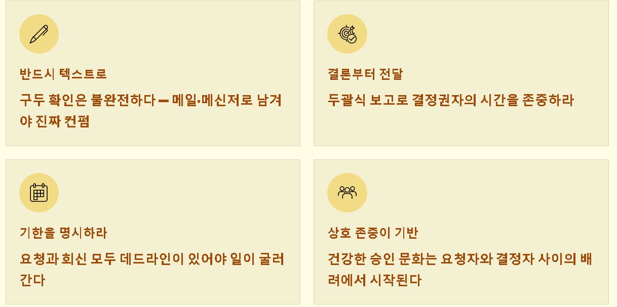 - 책임과 권한의 명확화: 승인자가 결정에 서명하거나 확답을 주는 순간, 해당 결과물에 대한 공식적인 책임이 승인자에게 이동하며 실무자는 보호받을 수 있는 근거를 얻습니다.
