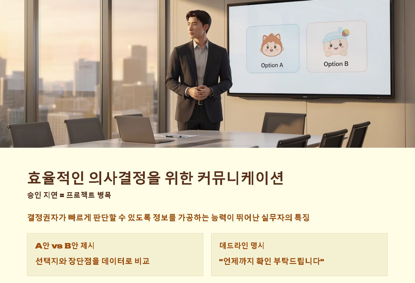 - 결론부터 말하는 두괄식 보고: 바쁜 상사에게는 핵심 결론과 기대 효과를 먼저 말하고, 상세 근거는 요청 시 제공하는 방식이 신속한 확답을 이끌어내는 비결입니다.
