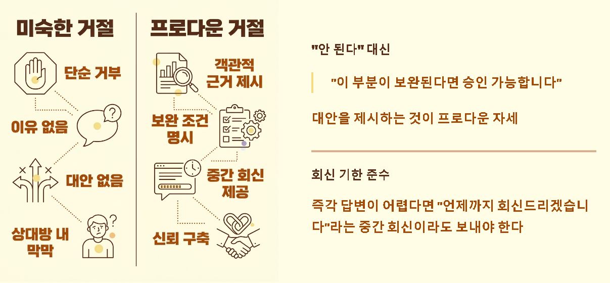 - 명확한 거절의 사유: 단순히 직관에 의존한 거절이 아니라, 회사 방침이나 예산 상황 등 객관적인 근거를 들어 설명함으로써 실무자가 납득하고 대안을 찾을 수 있게 도와야 합니다.