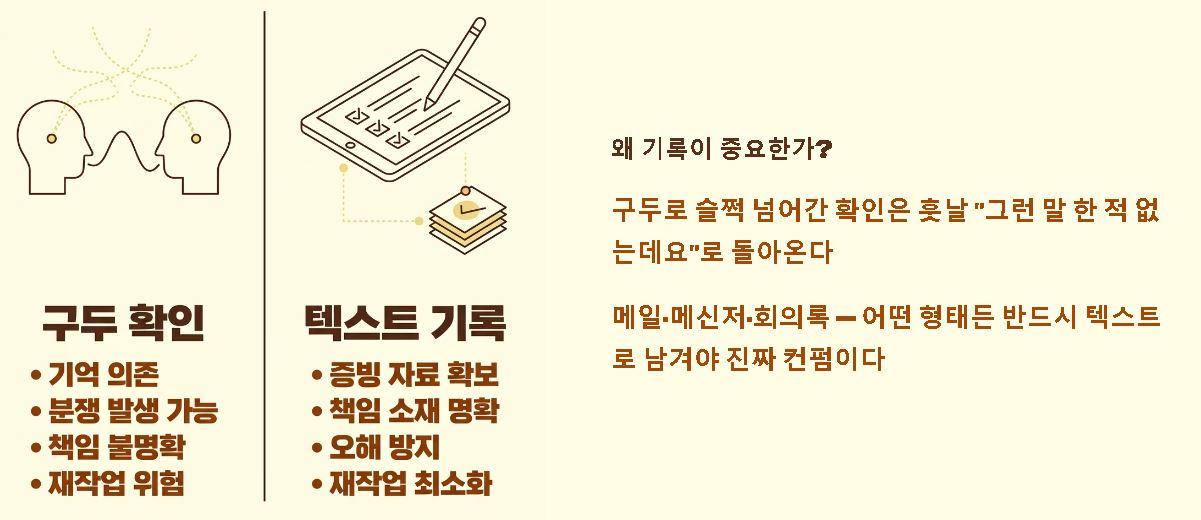 - Q: 구두로 승인받았는데 나중에 딴소리하면 어쩌죠? 대화 직후 "방금 논의하신 대로 진행하겠습니다"라는 요약 메일이나 메시지를 보내어 기록을 남겨두는 '셀프 방어'가 필수입니다.