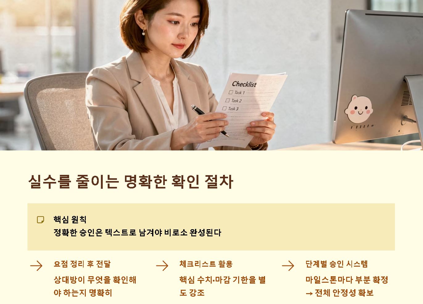 - 체크리스트의 활용: 승인자가 놓치기 쉬운 핵심 수치나 마감 기한 등을 별도로 강조하여, 승인 과정에서 발생할 수 있는 인적 오류를 사전에 차단하는 지혜가 필요합니다.
