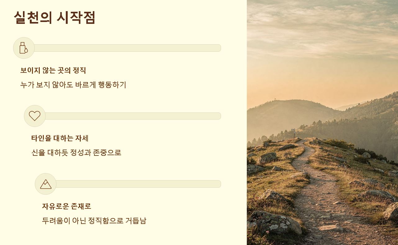 - 말과 행동의 일치: 타인의 비판보다 자신의 양심에 부끄러움이 없는지 먼저 살핍니다.