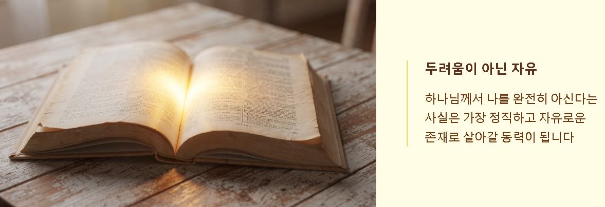 코람데오의 삶은 거창한 것이 아니라 일상의 작은 순종에서 시작됩니다. 보이지 않는 곳에서 정직을 실천하고, 타인을 대할 때 신을 대하듯 정성을 다하는 태도가 바로 그것입니다. '나의 모든 것이 알려져 있다'는 인식은 우리를 두렵게 하는 것이 아니라, 오히려 가장 정직하고 자유로운 존재로 거듭나게 하는 동력이 됩니다.