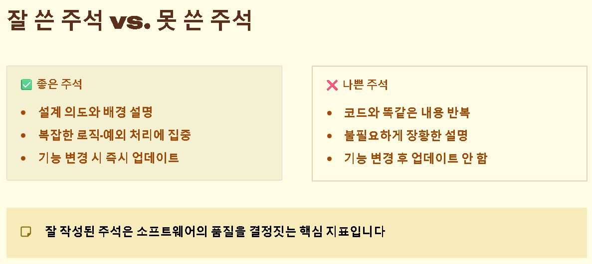 - 설계 의도와 배경 설명: 단순히 코드가 무엇을 하는지 나열하기보다 왜 이 방식을 택했는지 배경을 기록하여, 나중에 유지보수하는 사람이 의도를 오해하지 않게 합니다.