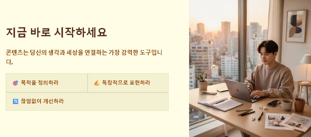 - 텍스트 기반: 블로그 포스팅, 뉴스레터, 전자책 등 깊이 있는 정보를 전달합니다.
