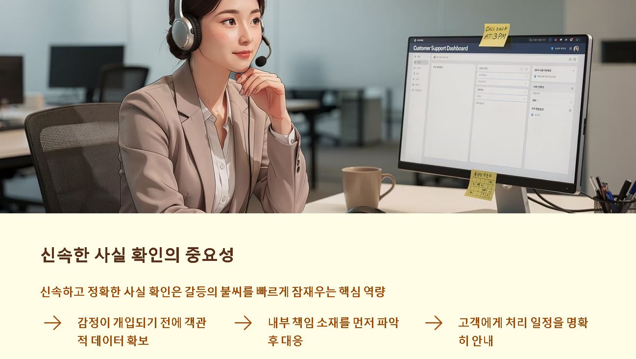 요약: 클레임 대응의 성패는 감정적인 다툼을 배제하고 사실 관계에 근거한 합리적인 해결책을 제시하느냐에 달려 있습니다.