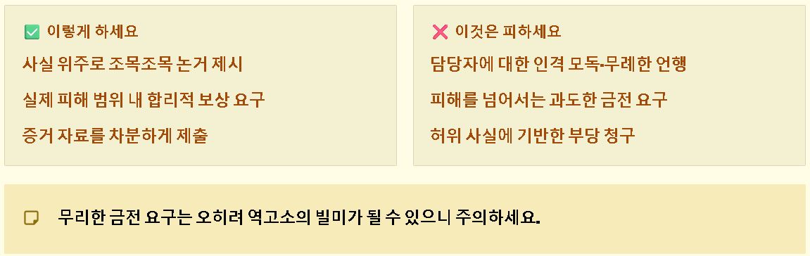 - 과도한 인격 모독 지양: 상담원이나 담당자에게 무례한 언행을 하기보다 사실 위주로 조목조목 따지는 것이 유리합니다.