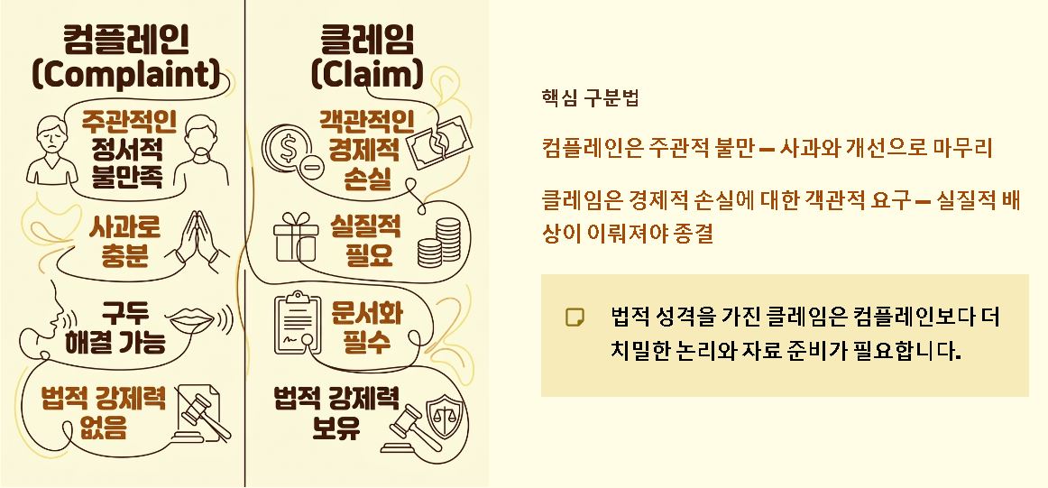 - 사후 처리의 차이: 컴플레인은 사과와 개선으로 마무리되기도 하지만, 클레임은 실질적인 배상이 이뤄져야 종결됩니다.