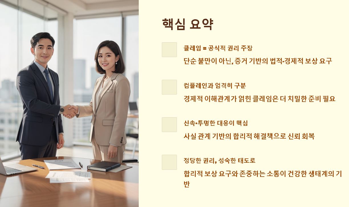 요약: 클레임은 경제적 이해관계가 얽힌 공식적인 항의이므로 컴플레인보다 더 치밀한 논리와 자료 준비가 필요합니다.