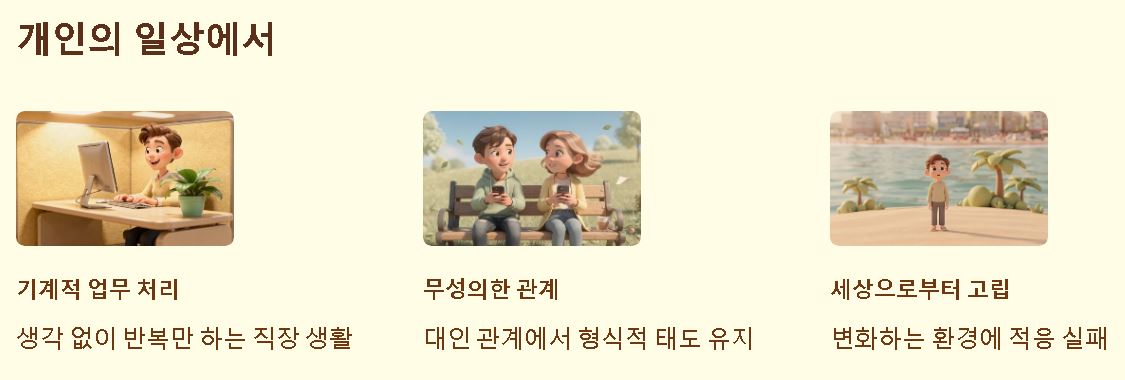 - 도전 의식 상실: 새로운 제안이나 변화를 귀찮게 여기고 거부감을 느끼게 됩니다.