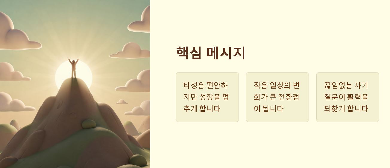 요약: 일상의 작은 습관을 의도적으로 바꾸고 끊임없이 자신의 삶에 질문을 던지는 태도를 통해 타성에서 벗어나 활력을 되찾을 수 있습니다.