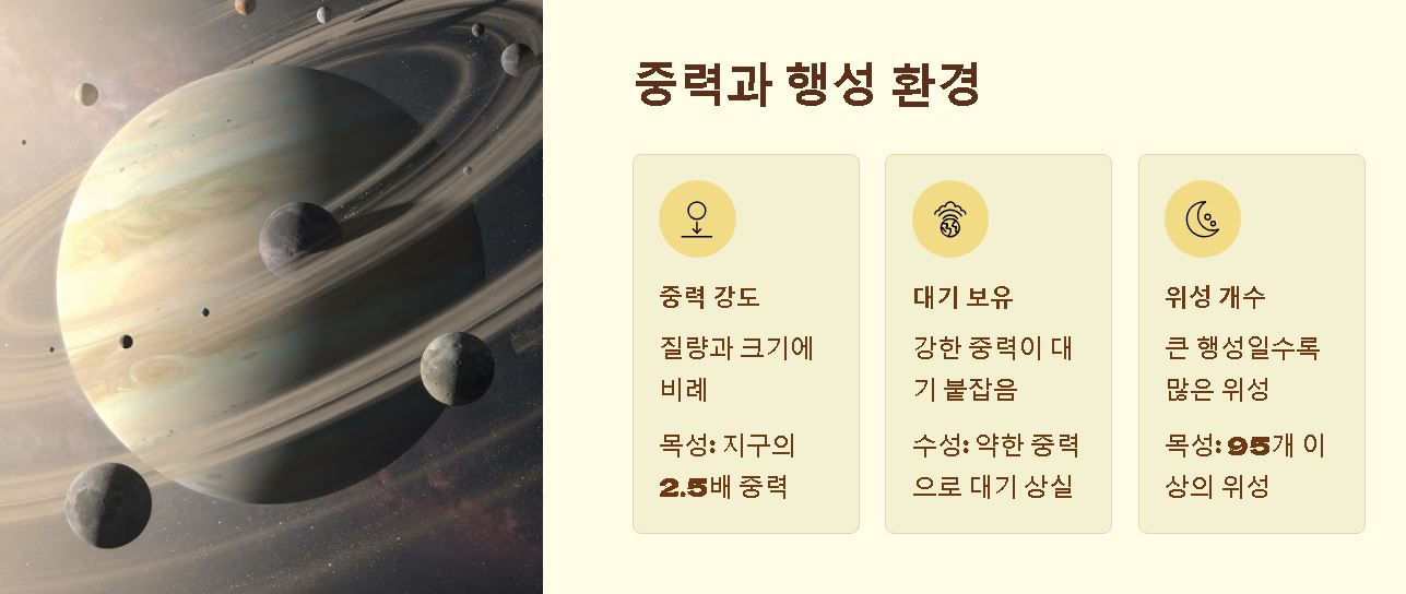- 대기 보유: 크기가 작은 수성은 중력이 약해 대기를 거의 유지하지 못하고 우주로 날려 보냅니다.