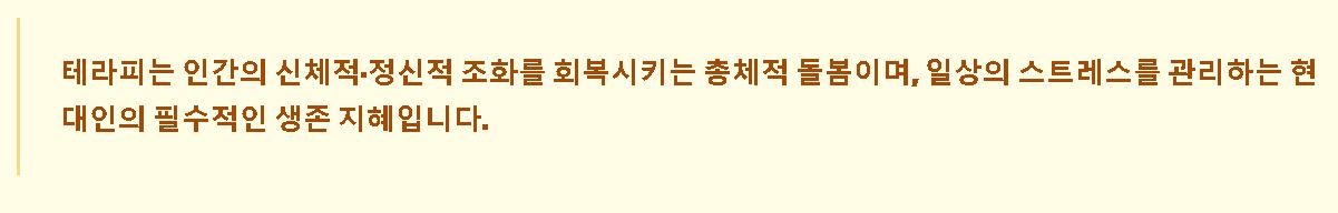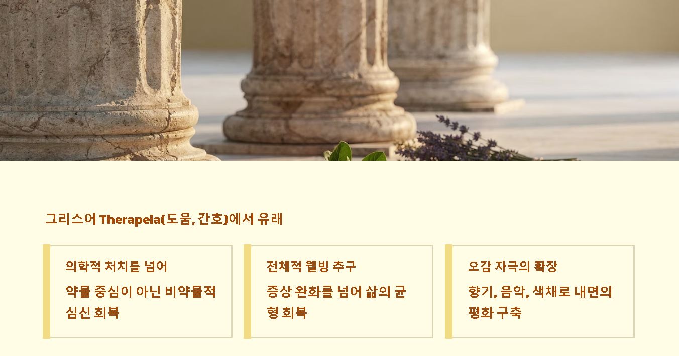- Q: 테라피와 의학적 치료의 결정적 차이는? 의학적 치료가 질병의 '제거'에 집중한다면, 테라피는 삶의 질 향상과 전인적인 '회복' 및 예방에 더 큰 비중을 둡니다.