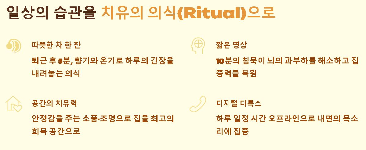 치유는 특별한 장소가 아닌 우리가 머무는 매 순간 속에서 일어나야 합니다. 일상의 사소한 습관을 치유의 의식(Ritual)으로 바꾸는 태도가 중요한데요. 퇴근 후 따뜻한 차 한 잔을 마시거나 짧은 명상을 하는 것만으로도 훌륭한 테라피가 됩니다. 전문가의 도움도 중요하지만, 스스로를 돌보는 '자기 자비'의 능력을 키우는 것이야말로 가장 강력한 치유의 시작입니다.