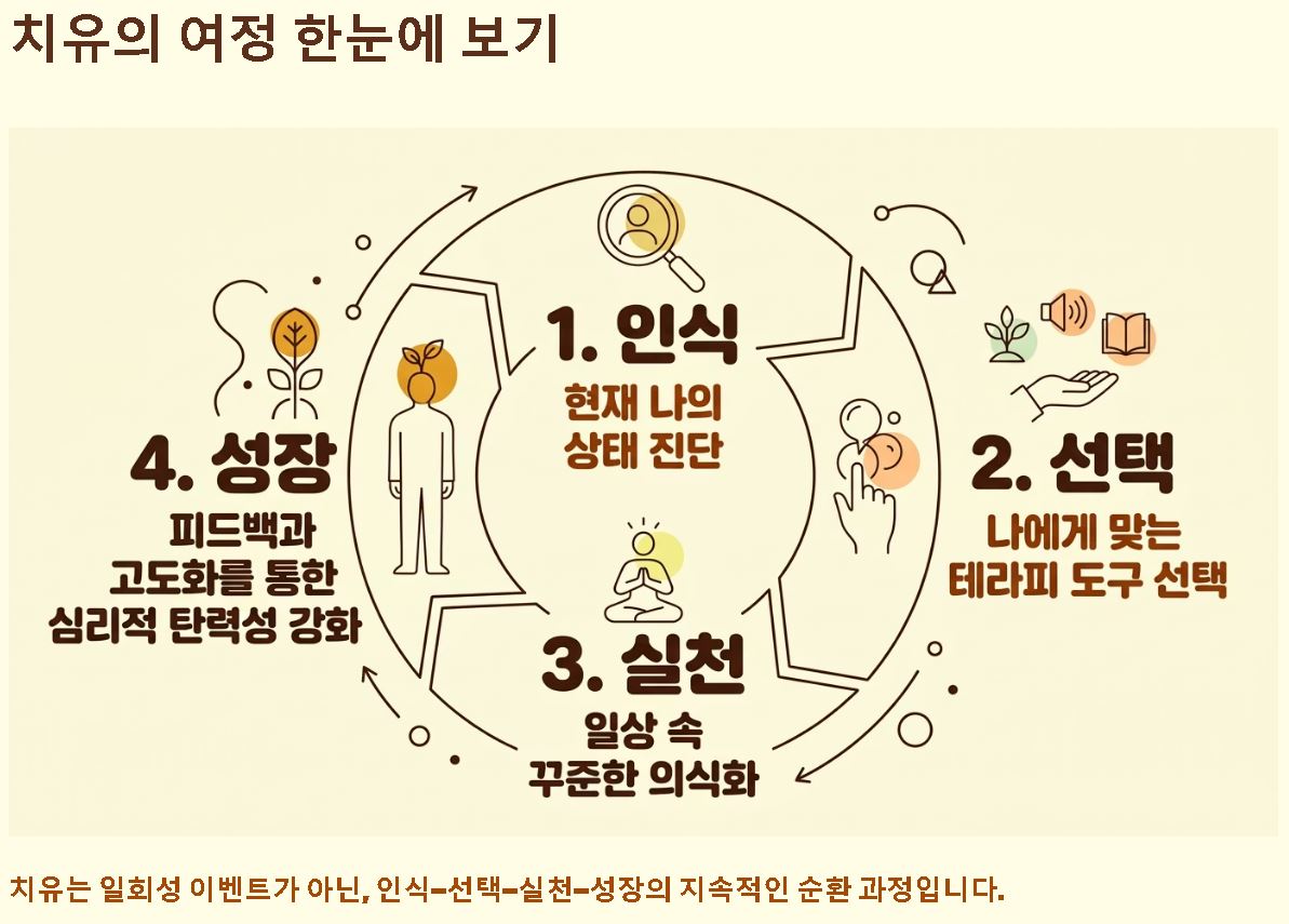 - 맞춤형 실행 도구 선택: 자신의 증상에 최적화된 치유 기법을 선택하고, 이를 일상에서 유지할 수 있는 구체적인 행동 매뉴얼을 설계하여 실행에 옮깁니다.