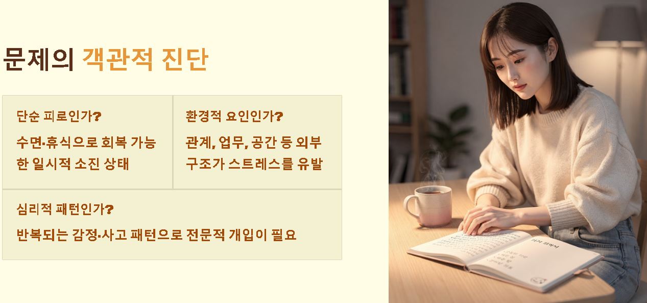- 문제의 객관적 진단: 현재 겪고 있는 고통이 단순한 피로인지, 환경적 요인인지 명확히 파악하여 감성적 위로와 이성적 대처 사이의 균형을 잡습니다.