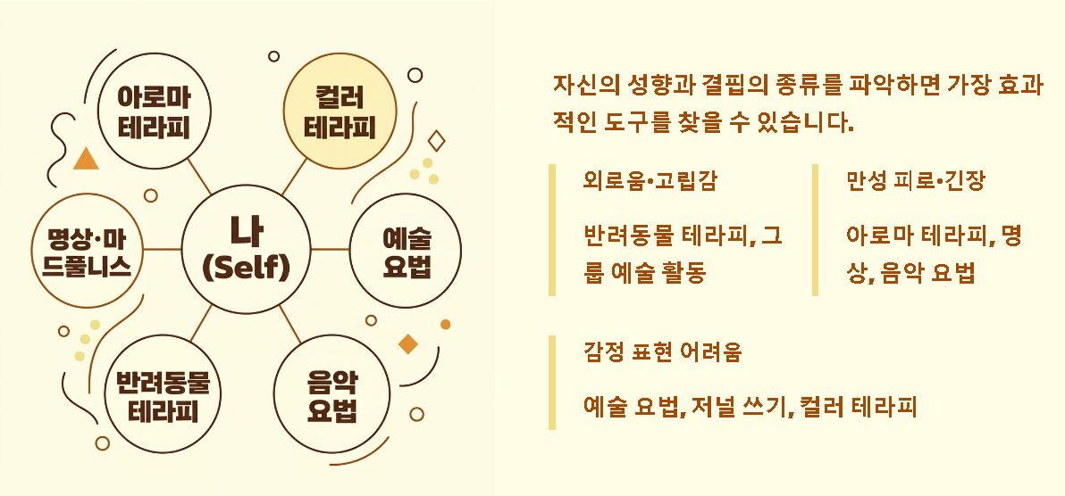 - 예술 및 음악 요법: 창작 활동이나 감상을 통해 언어로 표현하기 힘든 내면의 고통을 승화시키고 지적, 정서적 충만감을 얻는 창의적 치유 방식입니다.