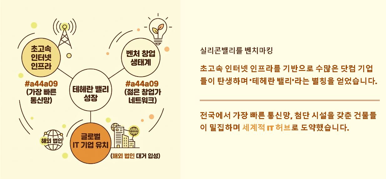 요약: 테헤란로는 1990년대 벤처 붐의 중심지로서 '테헤란 밸리'라는 별칭을 얻으며 한국이 IT 강국으로 도약하는 데 핵심적인 기지 역할을 수행했습니다.