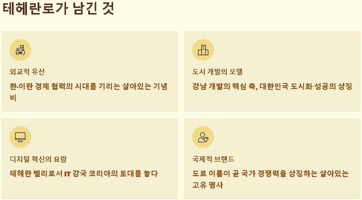 - 오일 쇼크와 경제 협력의 산물: 당시 중동 건설 붐과 에너지 안보가 중요했던 한국에게 이란은 매우 소중한 파트너였으며, 도로 이름 명명은 이러한 시대적 요구를 반영한 결과였습니다.