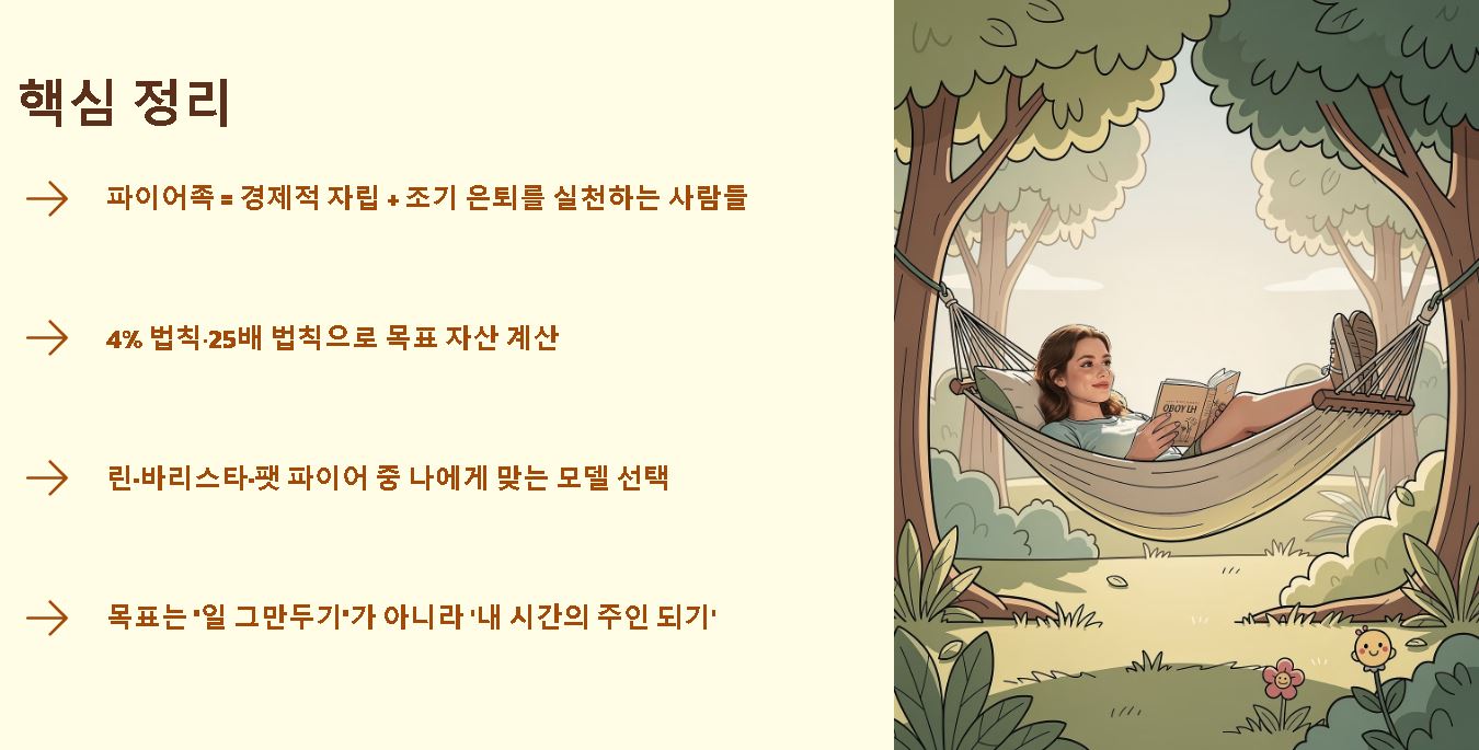 - 조기 은퇴(Retire Early): 정년인 60세까지 기다리지 않고, 30대나 40대에 직장 생활을 마무리하여 본인이 진짜 하고 싶은 일에 시간을 쓰는 것을 목표로 해요.