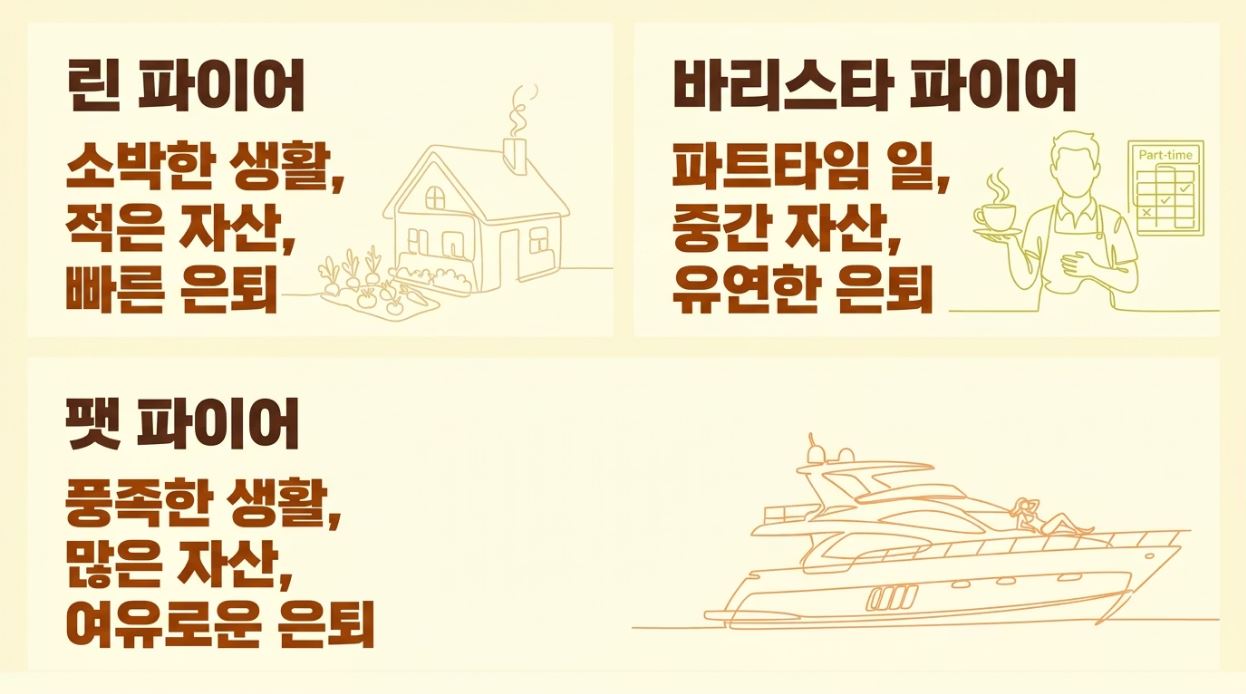 - 린 파이어(Lean FIRE): 극도로 소박한 생활을 유지하며 적은 자산으로 빠르게 은퇴하는 방식이에요. 미니멀리즘과 결합하여 소비 자체를 즐기지 않는 분들에게 적합해요.