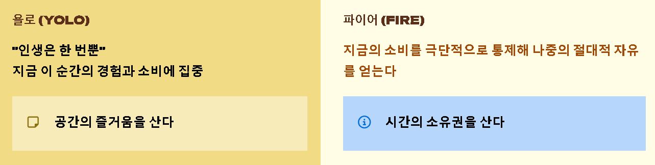 - 파이어(FIRE): 나중의 절대적인 자유를 위해 지금의 소비를 극단적으로 통제해요. 즉, 욜로가 '공간의 즐거움'을 산다면 파이어족은 '시간의 소유권'을 사는 데 투자하는 셈이에요.