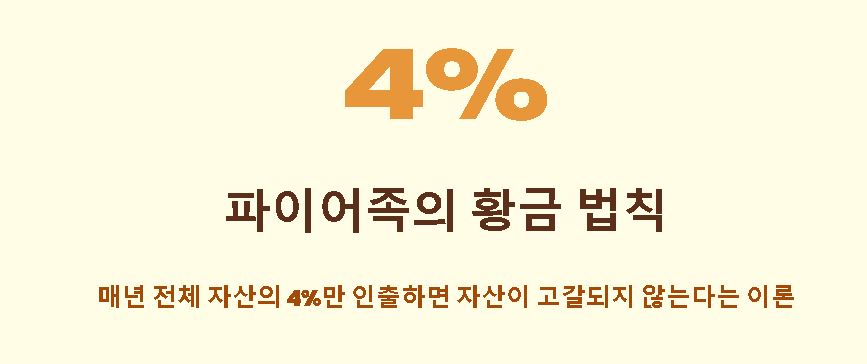 - 4% 법칙의 원리: 전체 자산의 4%만큼만 매년 생활비로 인출해서 쓰고, 나머지는 계속 투자하여 원금을 보존하는 방식이에요. 이렇게 하면 자산이 고갈되지 않고 영구적으로 생활이 가능하다는 이론이에요.
