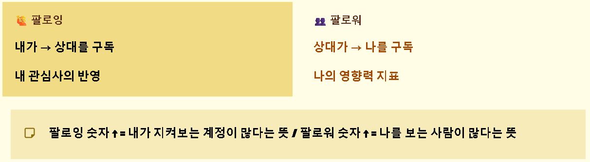 요약: 내가 상대를 따르는 것은 팔로잉, 상대가 나를 따르는 것은 팔로워로 구분하여 이해하면 쉽습니다.