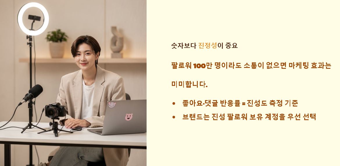 - 진성 팬덤의 중요성: 단순한 숫자보다 실제 소통이 활발한 '진성 팔로워'가 마케팅 가치 측면에서 훨씬 높게 평가받습니다.