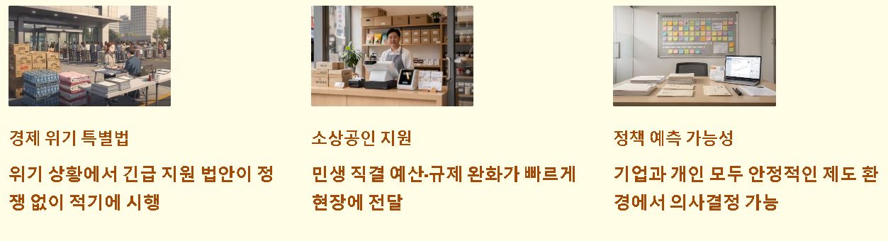 - 긴급 민생 예산 지원: 경제 위기 상황에서 필요한 특별법 등이 정쟁으로 묶이지 않고 적기에 시행될 수 있도록 하는 원동력을 제공합니다.