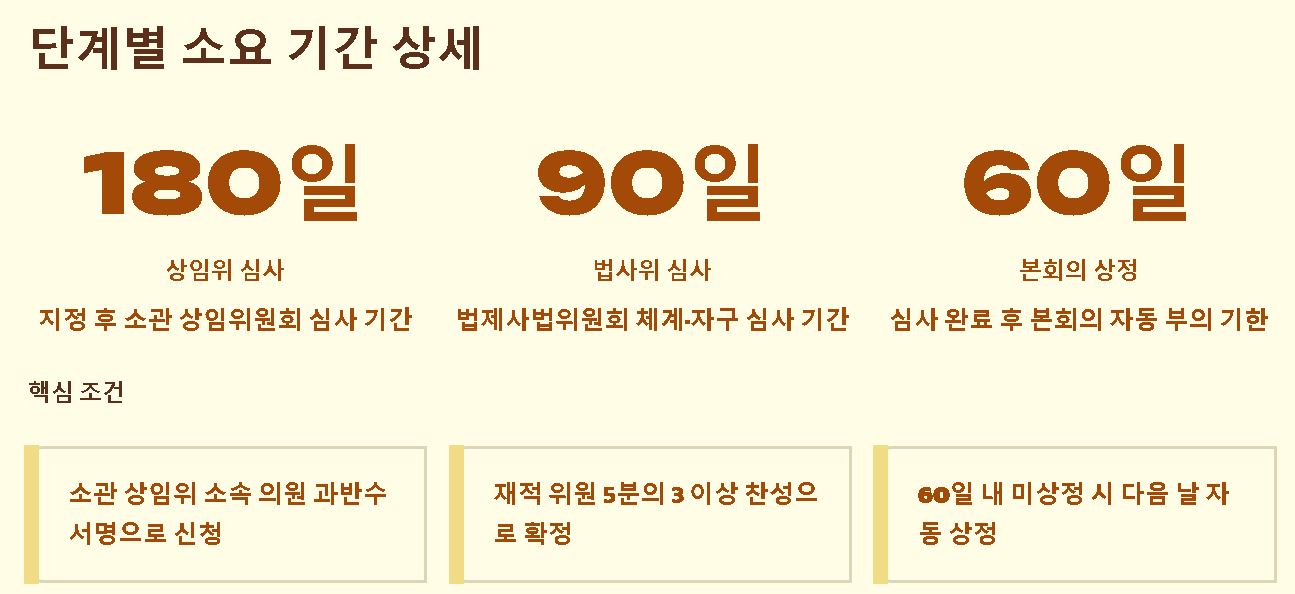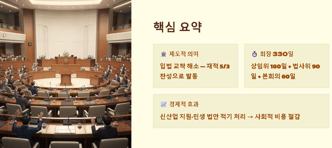 - 무기한 지연의 방지: 상임위원회에서 논의가 막히더라도 최대 330일이 경과하면 본회의에 자동으로 상정되어 최종 판단을 받을 수 있게 합니다.