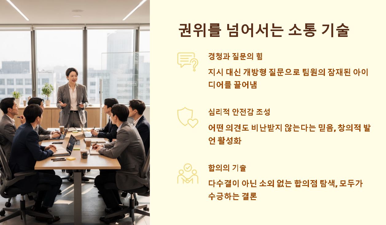 - 경청과 질문의 힘: 지시 대신 개방형 질문을 던져 팀원들의 잠재된 아이디어를 밖으로 끌어냅니다.