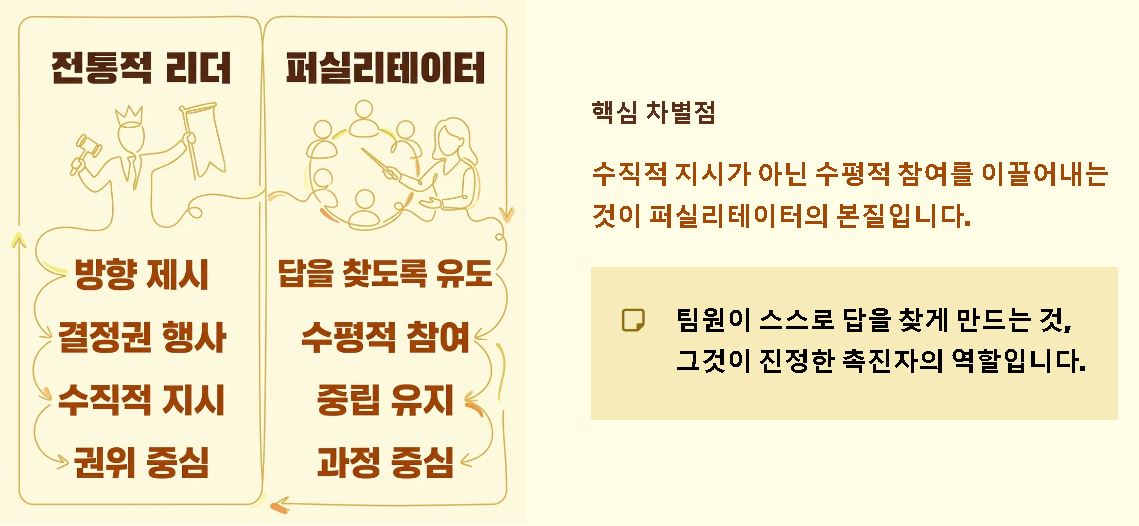 요약: 촉진자는 권위를 내려놓고 구성원 개개인이 역량을 최대한 발휘할 수 있는 환경을 구축하는 데 집중합니다.