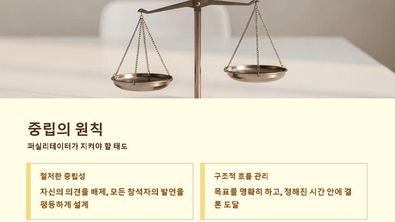 - 철저한 중립성 유지: 자신의 의견을 배제하고 모든 참석자의 발언이 평등하게 다뤄지도록 설계해야 합니다.