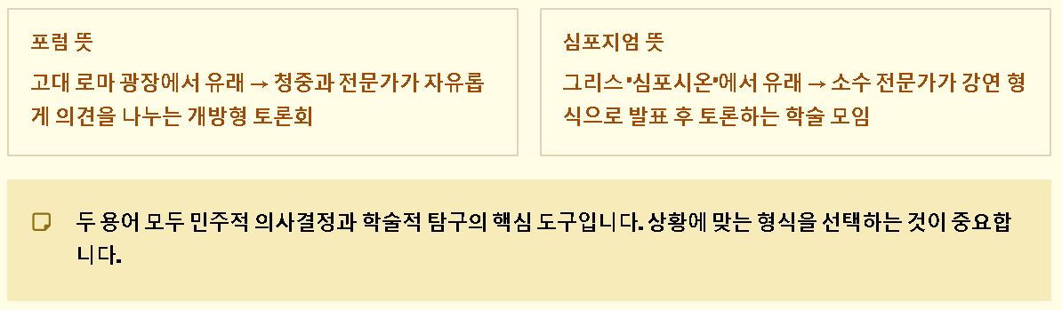 - Q: 세미나나 워크숍과는 무엇이 다른가요? 세미나는 소규모 연구 모임, 워크숍은 실습과 훈련 중심인 반면 포럼과 심포지엄은 대규모 인원이 모여 담론을 형성하는 데 중점을 둡니다.