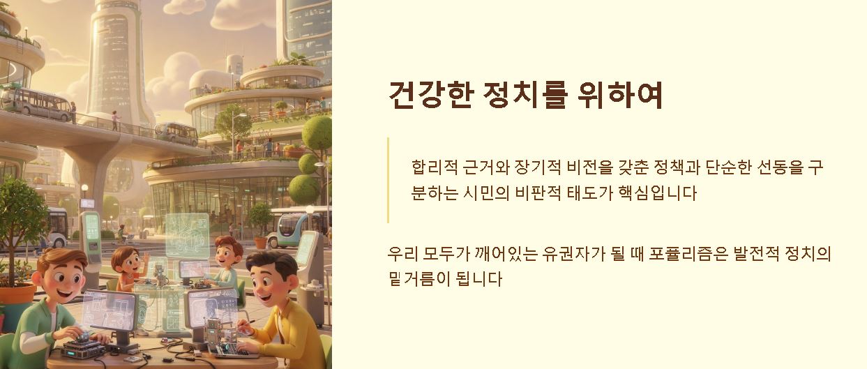 결국 중요한 것은 어떤 정책이 건강한 '대중주의'인지, 아니면 위험한 '선동'인지를 구분하는 안목입니다. 정책의 실현 가능성과 재원 마련 대책이 충분한지, 갈등을 조장하기보다 해결책을 제시하는지를 꼼꼼히 따져봐야 하는데요. 깨어있는 시민들의 비판적 사고가 있을 때 포퓰리즘은 비약적으로 발전적인 정치를 만드는 밑거름이 될 수 있습니다.
