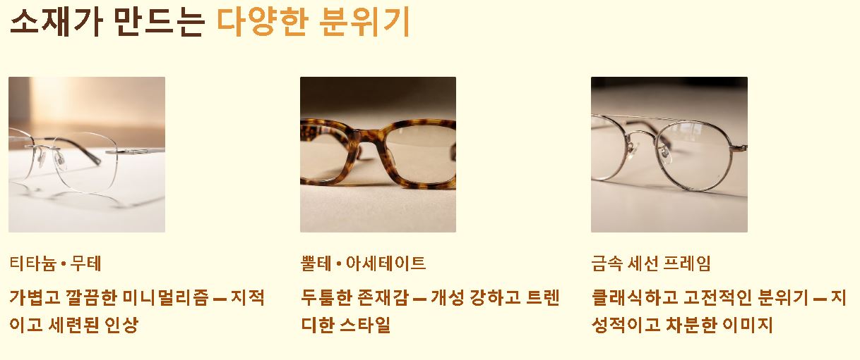 - 소재에 따른 기능성: 티타늄, 뿔테, 무테 등 프레임의 소재와 디자인에 따라 지적인 느낌부터 활동적인 느낌까지 다채로운 분위기 연출이 가능합니다.