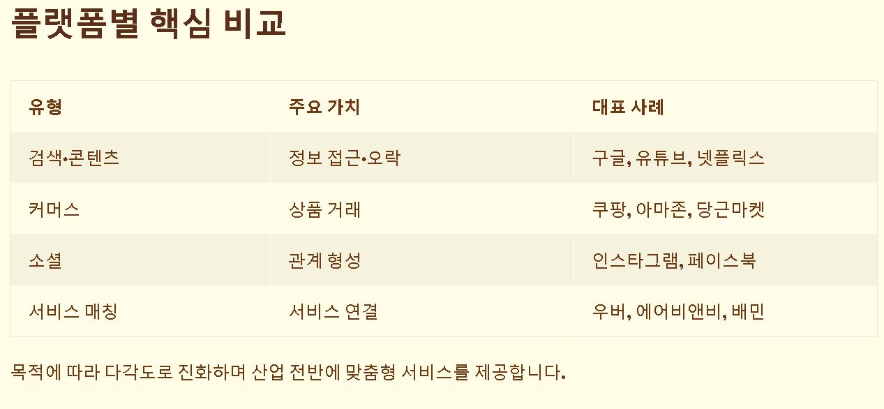- 검색/콘텐츠 플랫폼: 구글, 유튜브, 넷플릭스처럼 정보를 찾거나 즐기는 공간입니다.