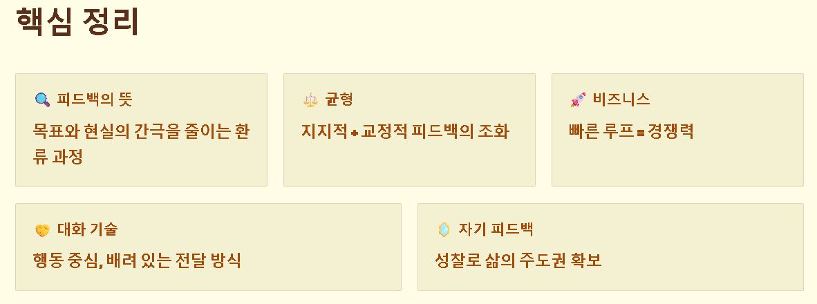 - 경청의 자세: 피드백을 받을 때는 변명보다 상대의 의도를 파악하는 것이 우선입니다.